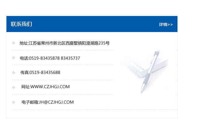 傳真:0519-83435688    郵編:213135    網址:WWW.czjhgj_com.trusting-sh.com    電子郵箱:JH@czjhgj_com.trusting-sh.com